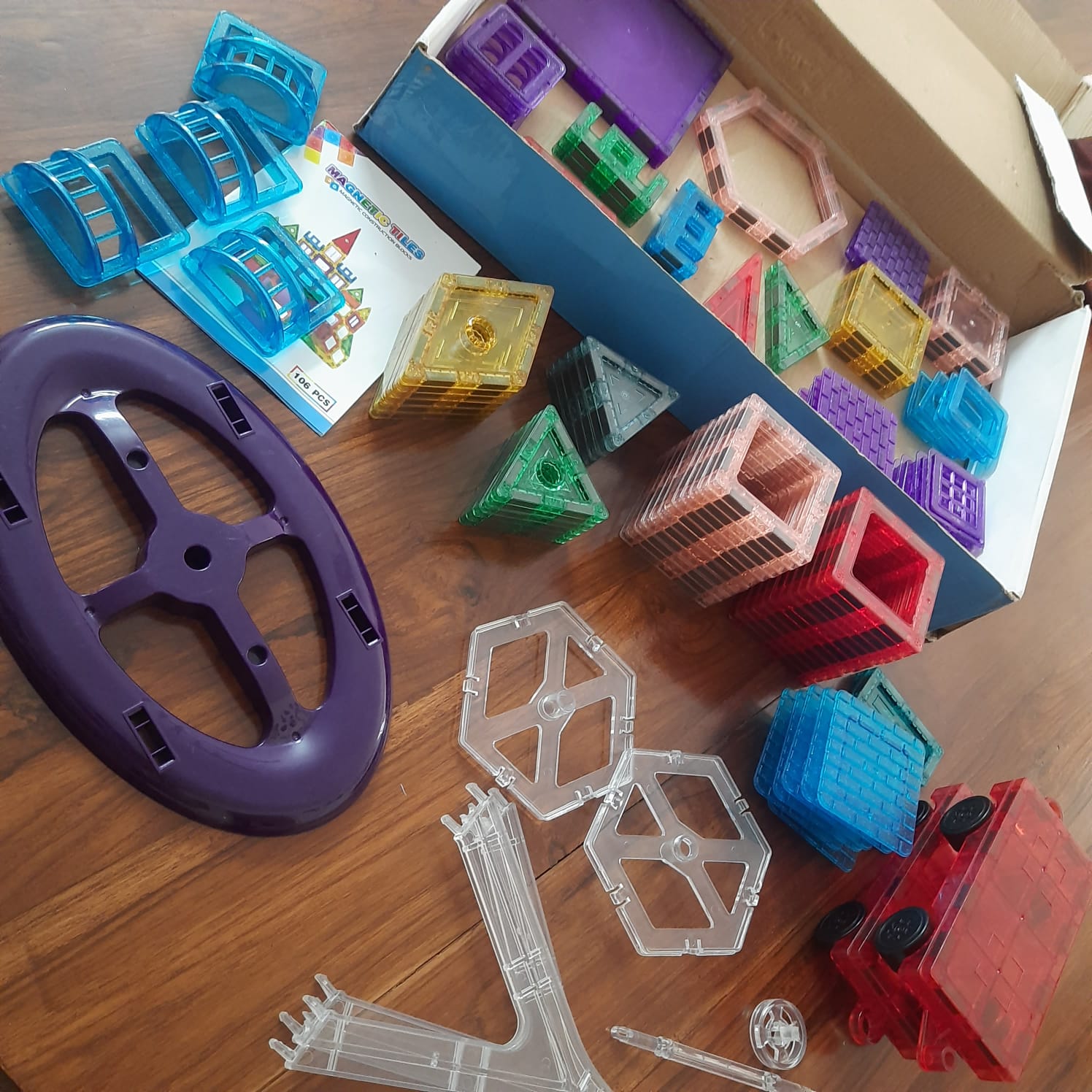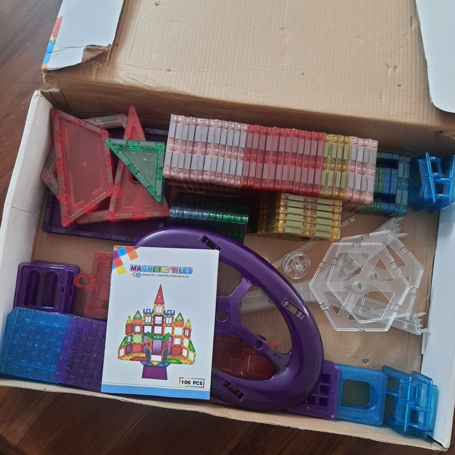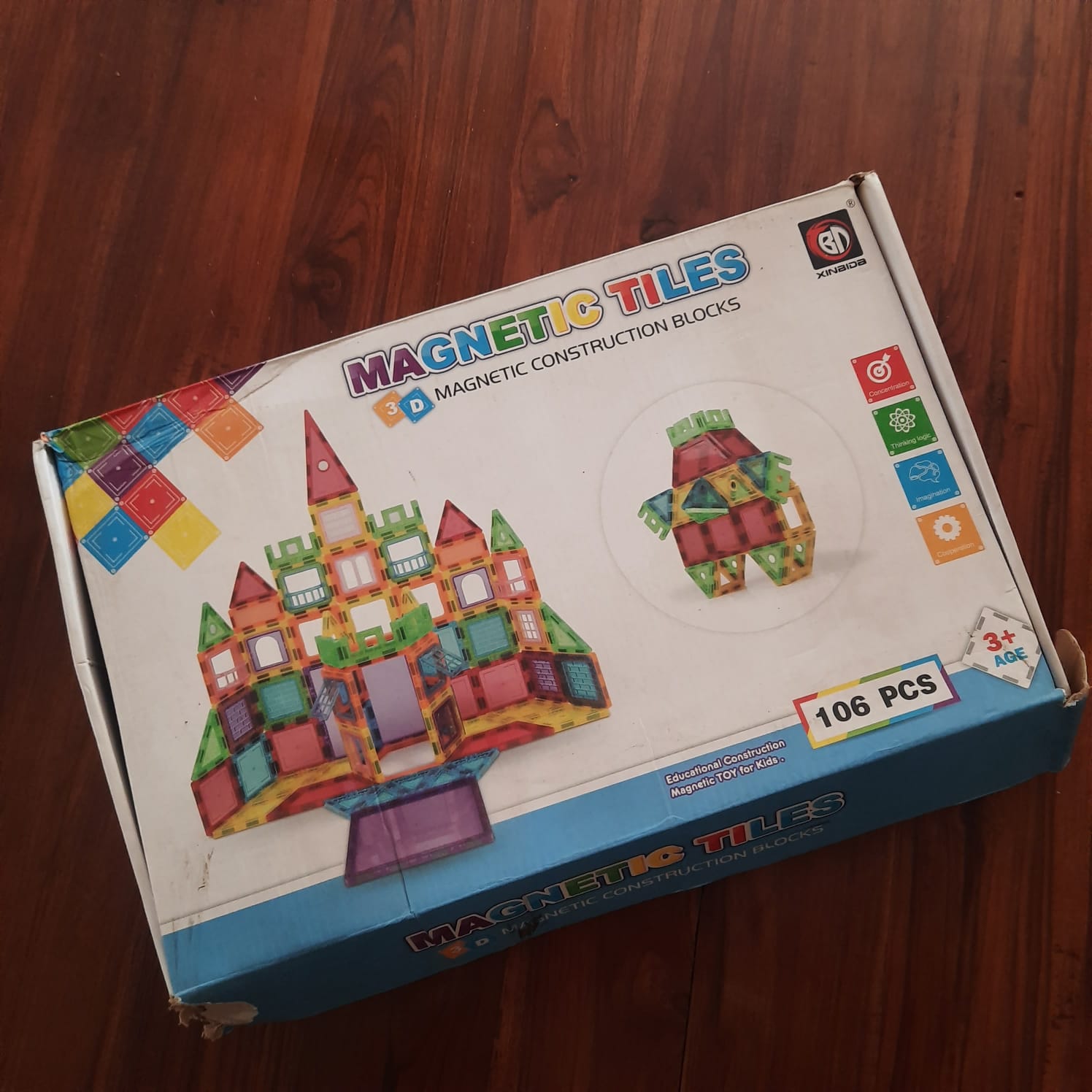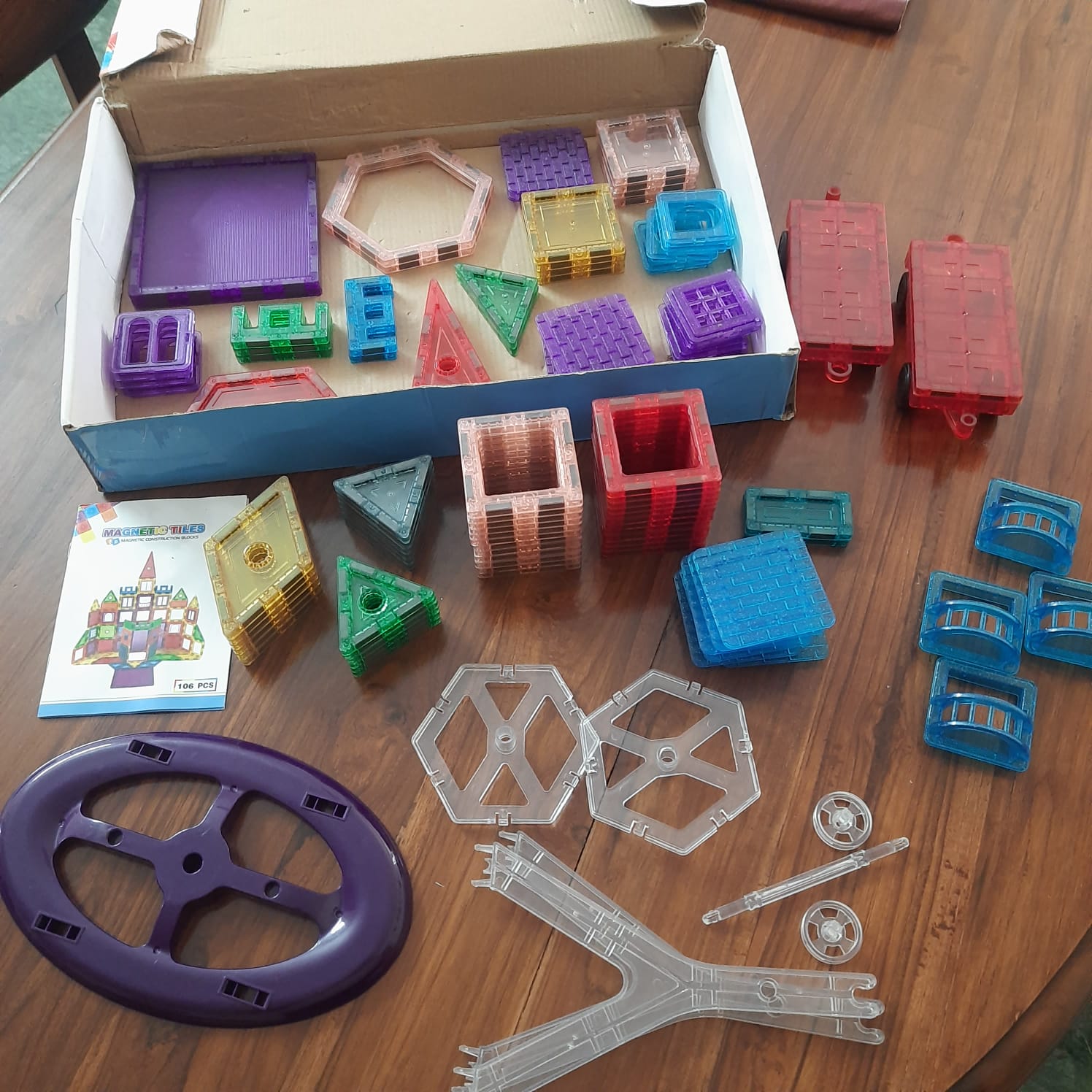 Product Description - 106 pieces Magna tiles / magnetic tiles set from Braintree brand. - 106 pieces Magna tiles / magnetic tiles set from Braintree brand. . There are many cheap versions available in market, this is high quality, had multiple shapes, sturdy and has 106 pieces. Played once or twice given it was bought when my kid was 9 and already old for this. And then we moved houses so this remained in packaging but it's almost like new. Comes with a play manual in original box.