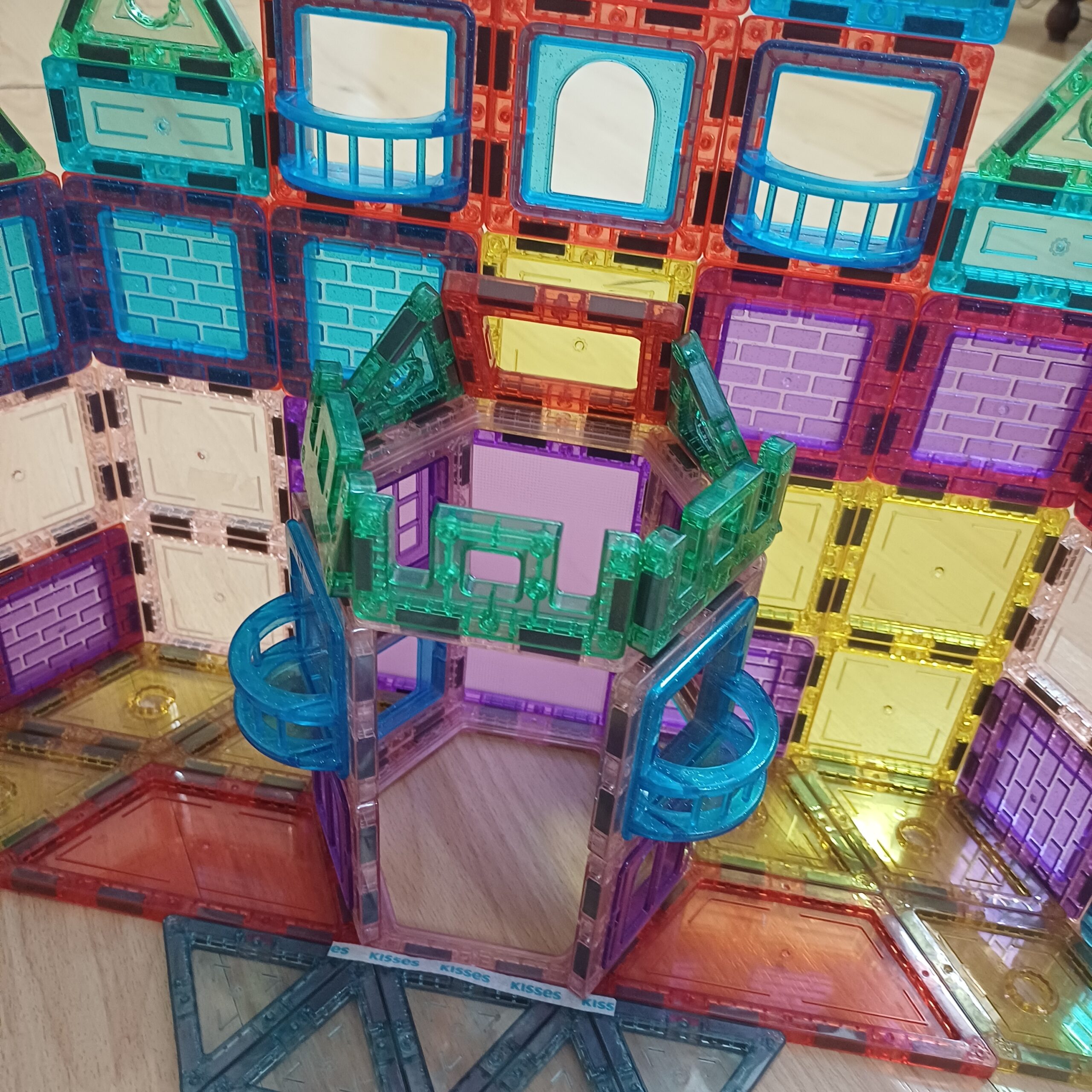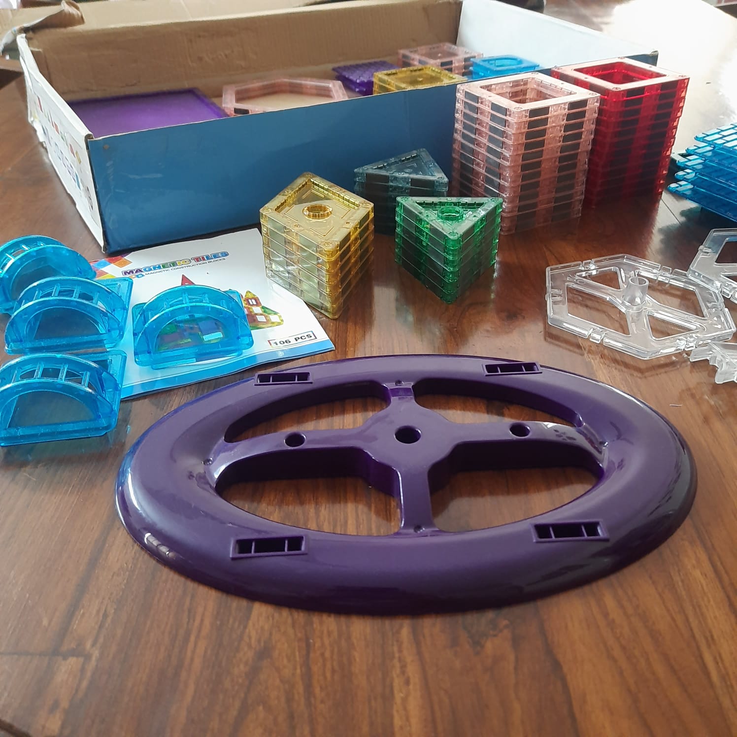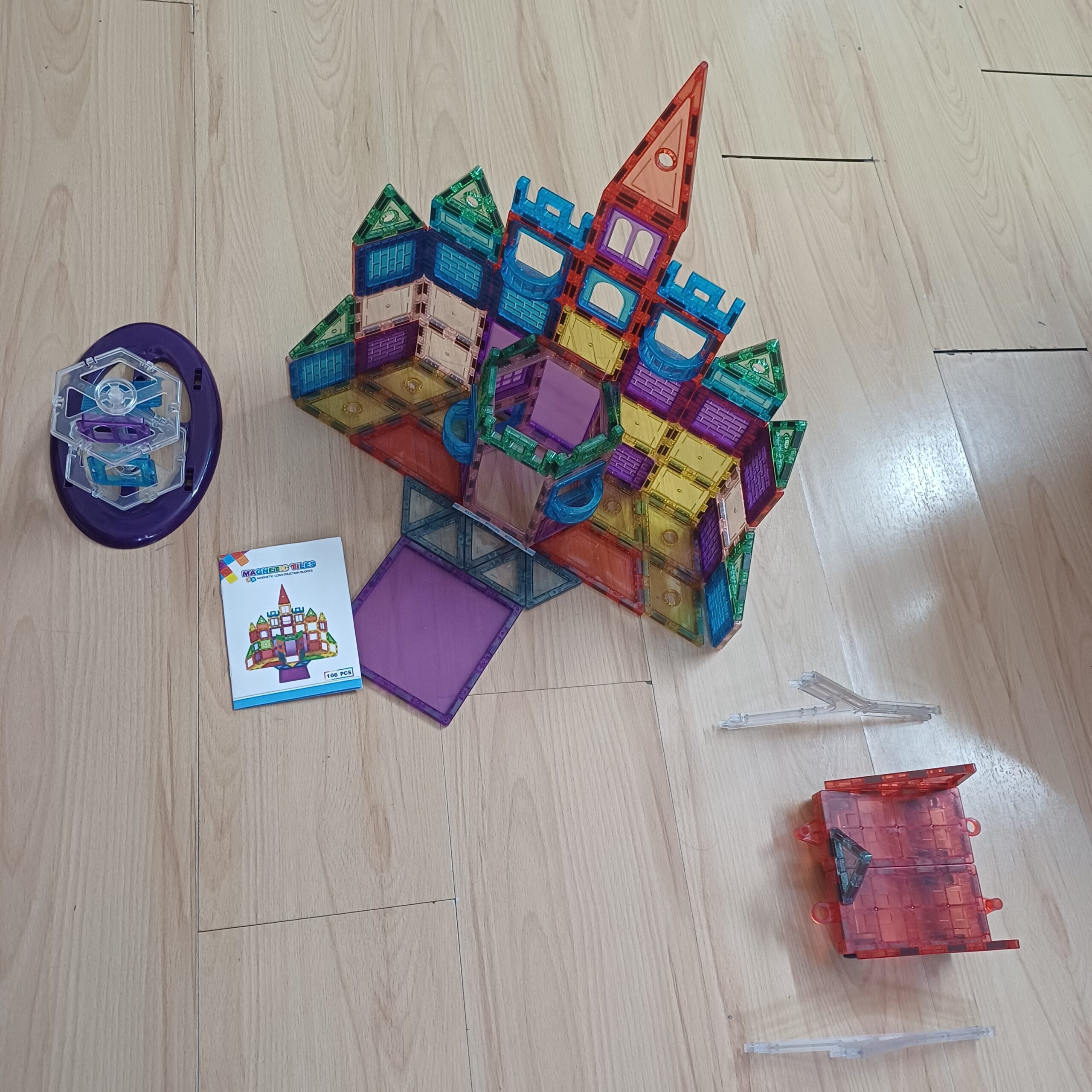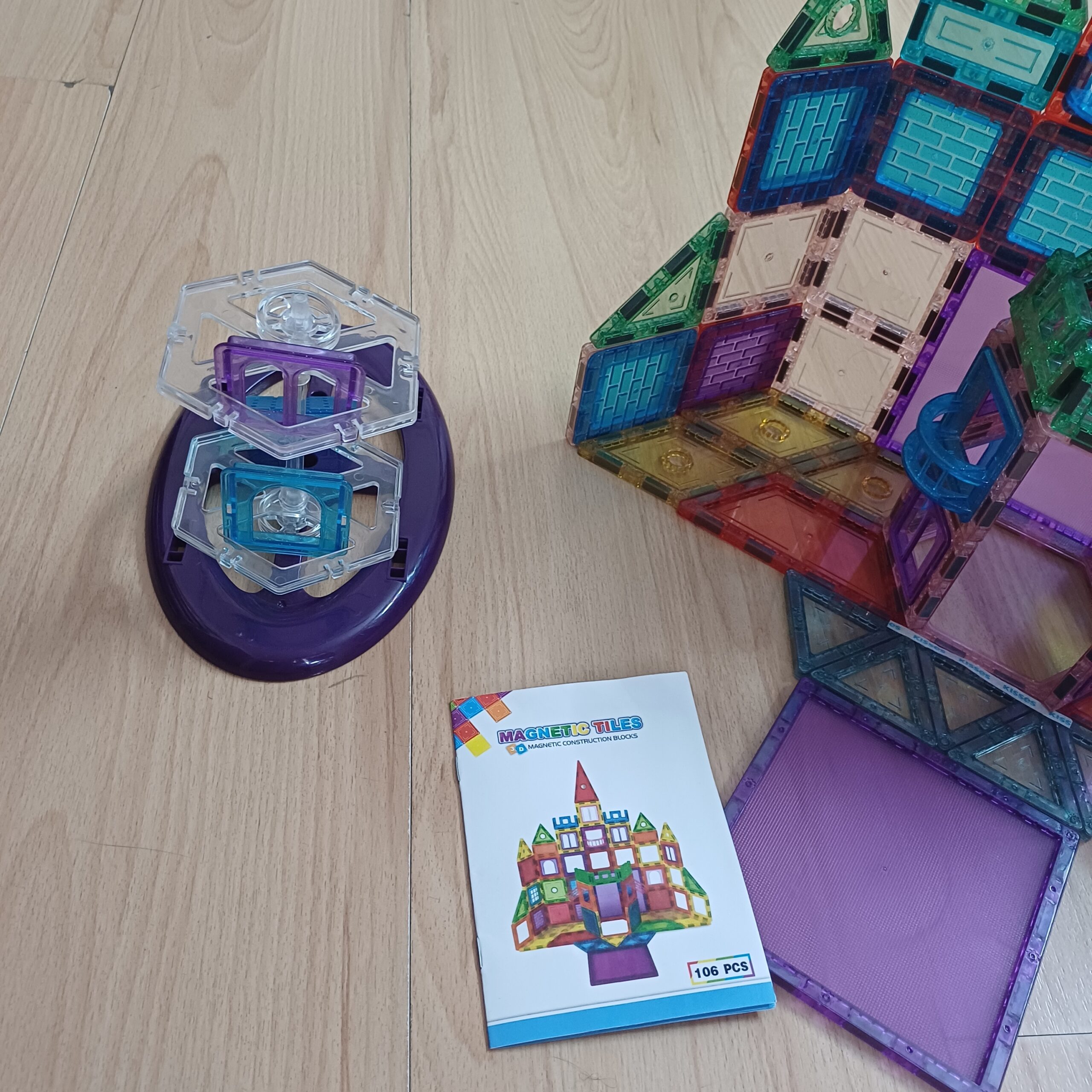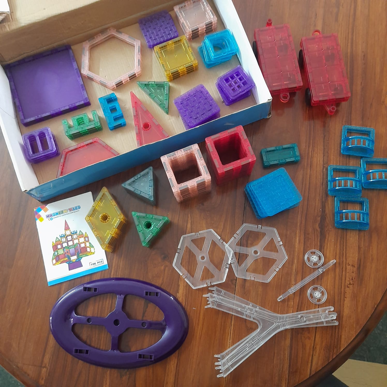 Product Description - 106 pieces Magna tiles / magnetic tiles set from Braintree brand. - 106 pieces Magna tiles / magnetic tiles set from Braintree brand. . There are many cheap versions available in market, this is high quality, had multiple shapes, sturdy and has 106 pieces. Played once or twice given it was bought when my kid was 9 and already old for this. And then we moved houses so this remained in packaging but it's almost like new. Comes with a play manual in original box.