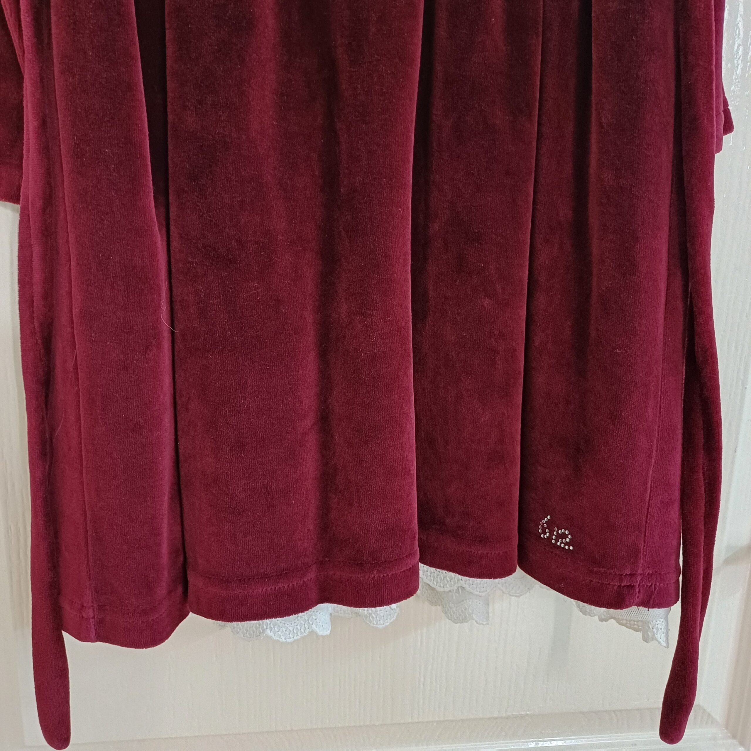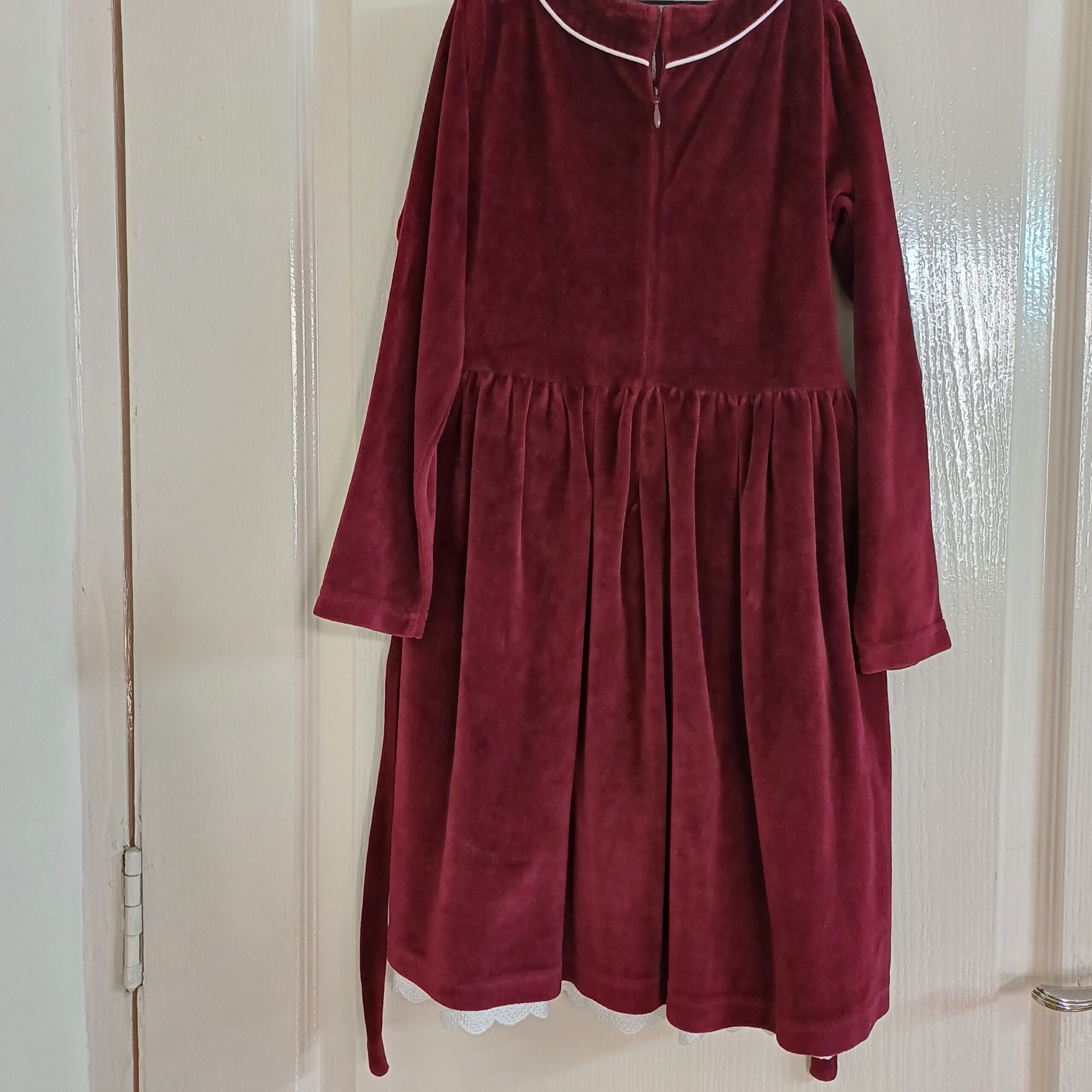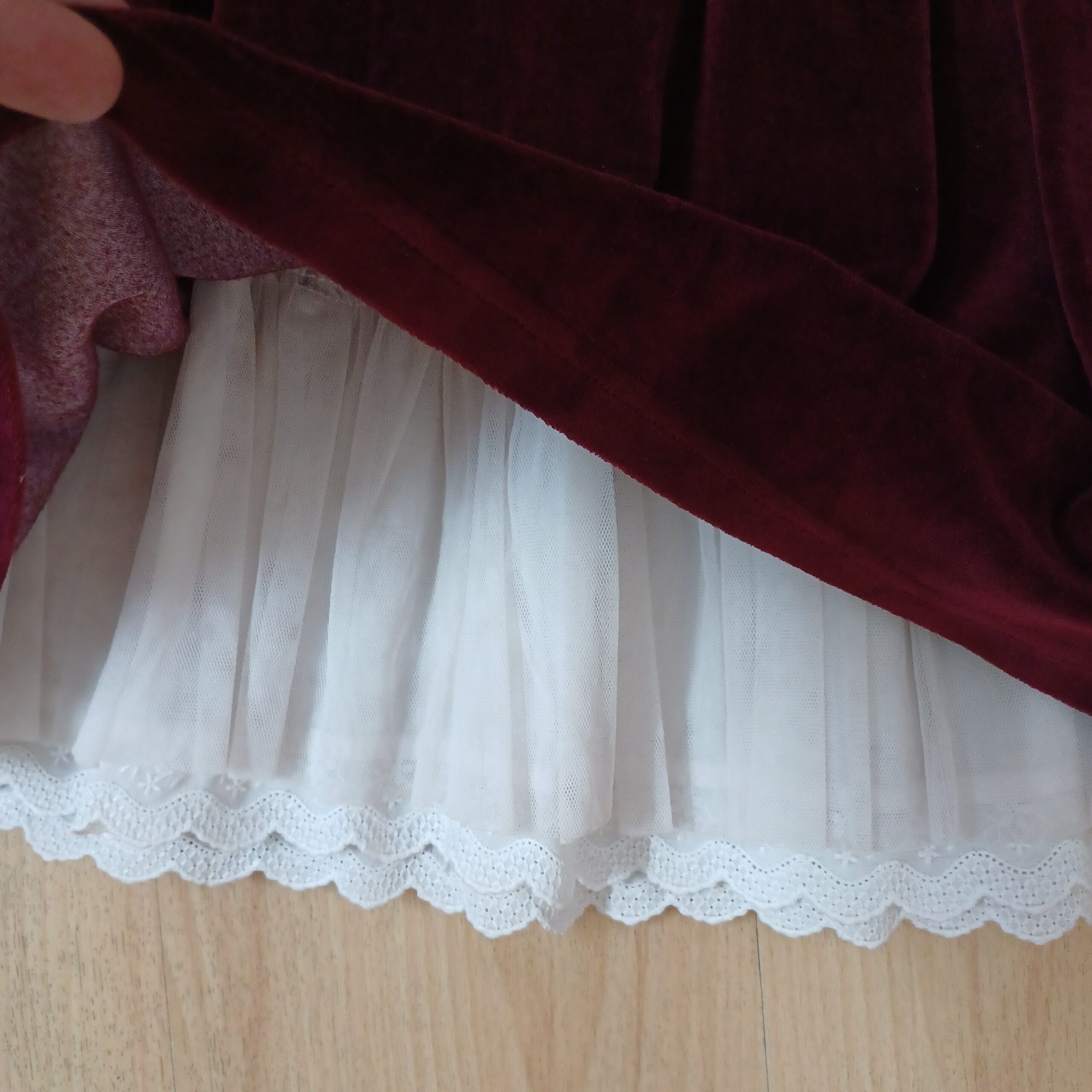 Product Description - Heavy Velvet dress in rich maroon colour. Great for winter parties, Christmas and new yr. Has victorian white lace trimmings at the bottom and tulle to give it flair. Comfy lining inside and zipper for easy wear. Worn twice so like new.