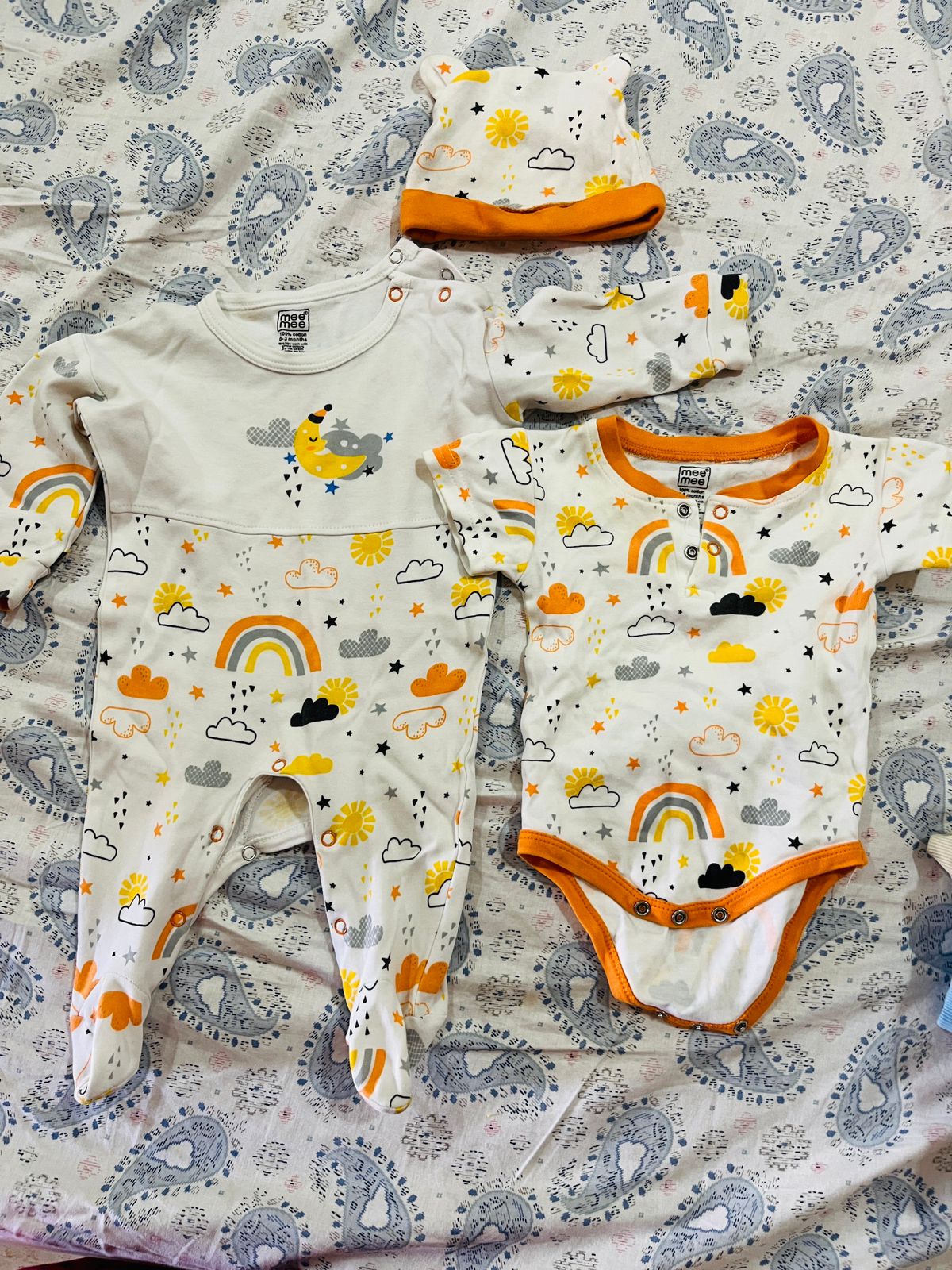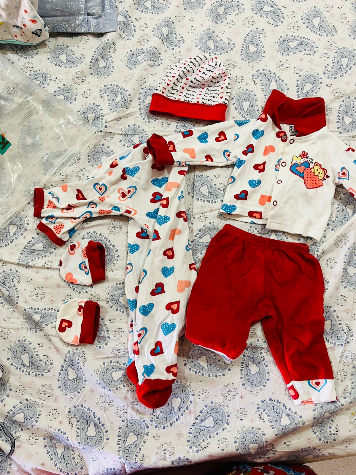 Product Description - Baby hug new born romper sets . 1. Orange sleep suit with cap 2. orange half romper 3. red sleep suits with cap and mittens 4. red tshirt payjama set